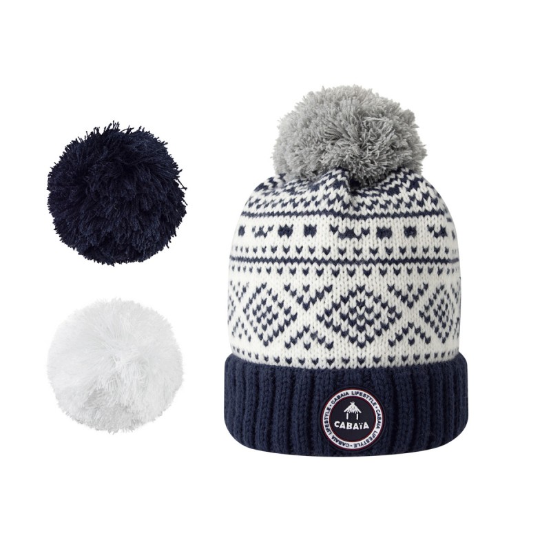 1 bonnet et trois pompons interchangeables (blanc, bleu marine et bicolore)