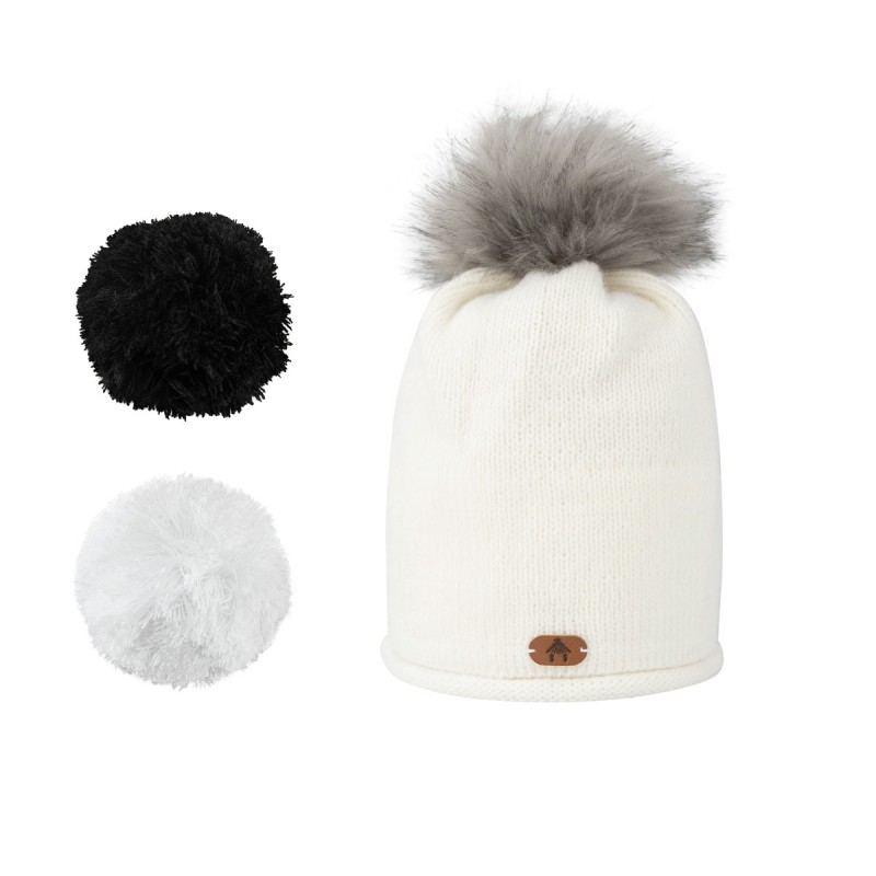 1 bonnet blanc et trois pompons interchangeables (blanc, noir et gris)